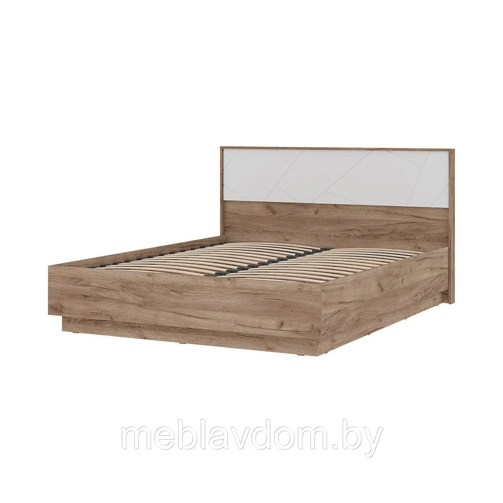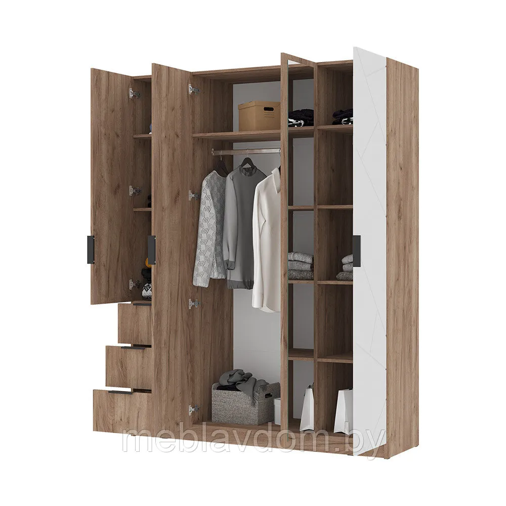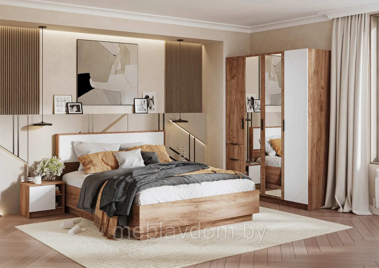 Спальный гарнитур "Орегон" — это изысканное и практичное решение для вашей спальни. В комплект входят двуспальная кровать с высоким изголовьем и ортопедическим основанием из натурального дерева, две прикроватные тумбы и вместительный четырехдверный шкаф с полками, штангами, выдвижными ящиками и зеркалом. Фасады из МДФ с геометрической фрезеровкой в белом цвете и корпус оттенка "Дуб Крафт табачный" создают атмосферу тепла и уюта, а белый цвет добавляет интерьеру легкости и визуально расширяет пространство.